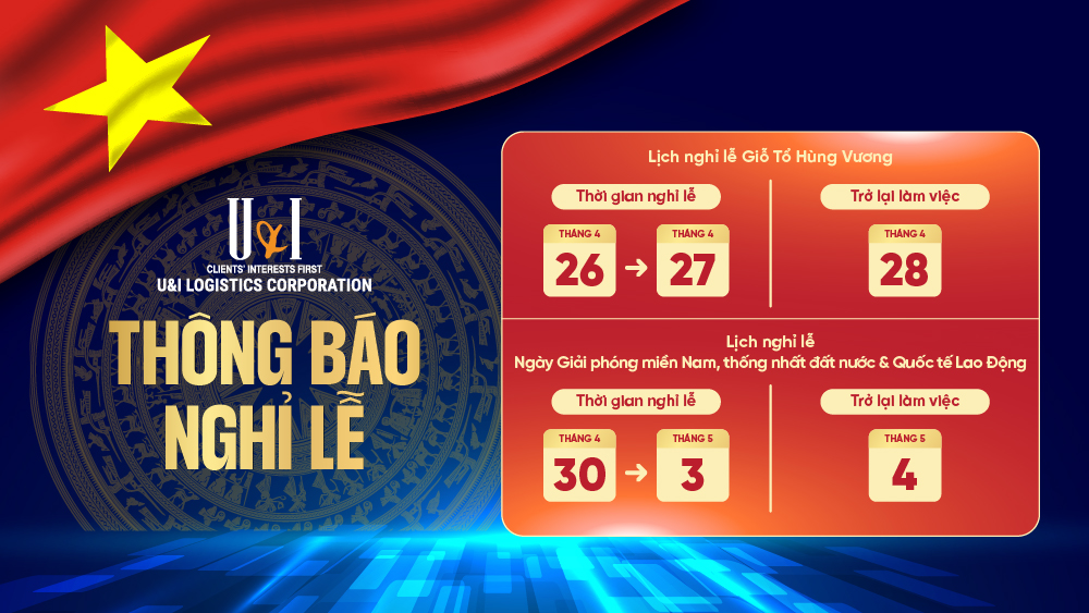 Nhằm nâng cao chất lượng phục vụ Quý khách hàng và đối tác, tạo sự thuận tiện trong việc lập kế hoạch xuất nhập khẩu cũng như giao dịch với Công ty, U&I Logistics trân trọng thông báo lịch nghỉ Lễ Giỗ Tổ Hùng Vương, Ngày Giải Phóng Miền Nam & Ngày Quốc Tế Lao Động 2026 như sau: